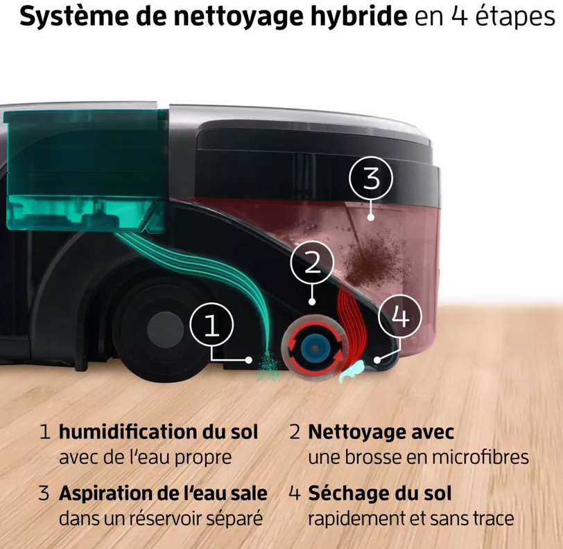 Autre(s) fonction(s) Compatible avec Amazon Alexa & Google Assistant, Anti-chocs, Anti-chute, Infrarouge (OSB), Gyroscope 2.0, Accéléromètre 360°, Caméra précise, Assistant vocal (multilingue), Fonctionnalités App (Cartographie en temps réel, Zones de nettoyage définies par l'utilisateur, Réglage de la puissance de rotation du rouleau, quantité d'eau réglable, Vitesse réglable de déplacement)