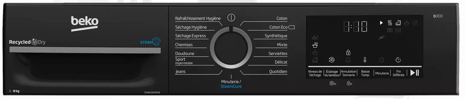 Programmes spéciaux Coton éco, Mix (quotidien), Serviettes, Minuterie, Lavage doux, Couette, Doudoune, Séchage hygiène, Express 14'