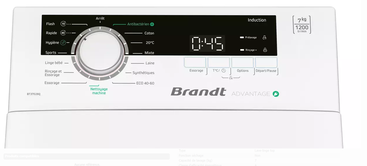 Programmes spéciaux Antibactérien, 20°C, Nettoyage machine, Linge bébé, Hygiène, Flash 15 min