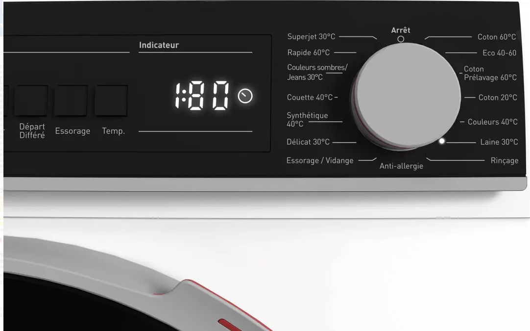 Programmes spéciaux Couleur, Rinçage, Anti-allergie, Essorage/vidange, Rapide 60, SuperJet